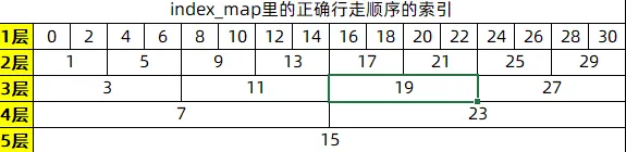 通过index_map这张表可以发现, 在第1层里每个索引号之间都差了2, 2可以表示为2的1次方, 第2层每个索引号之间都差了4即2的2次方,所以每个的索引号之间的规律是都相差了2^i, i是当前所在的第几层.所以如果要是还能知道每行行首的索引就能推算出所有的正确索引号了, 可以发现每行行首的规律都是2^(i-1)-1, i是在第i层, 比如第4层圆盘2^(4-1)-1=7, 所以第4层的行首索引是7